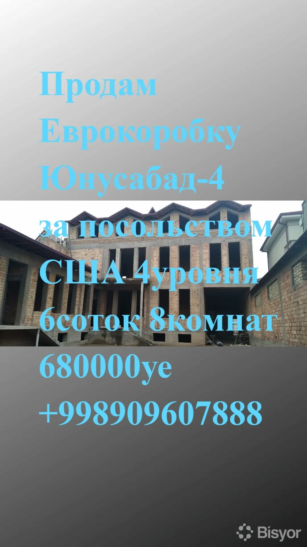 Продам Еврокоробку в элитной махалле Юнусабад-4 за посольством США. 6соток,4уровня(подвал+2этажа+мансарда),8комнат,6санузлов,огород,въезд авто.Махалля природная тихая спокойная.Закрытый двор.Ориентир Юнусабад-4 за клиникой Шифонур,за посольством США или за туйхона Шохсарой.