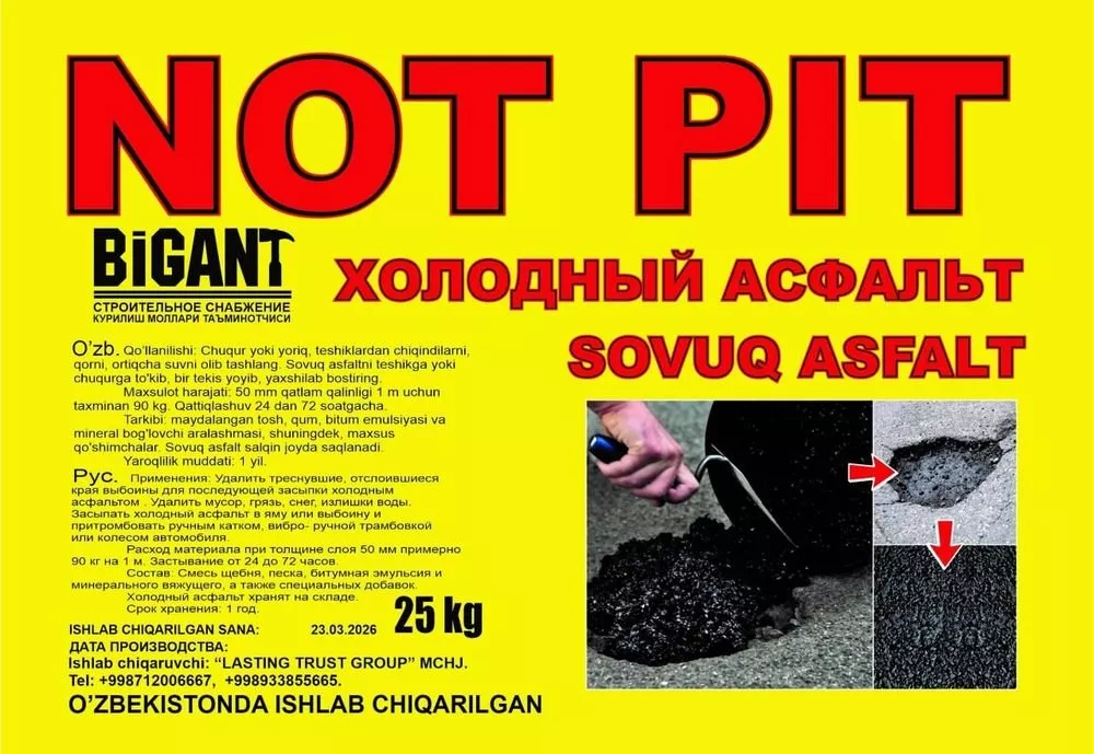 Предлагаем холодный асфальт для качественного ремонта дорог и тротуаров. Удобен в использовании, не требует специальных навыков. Доставка по Ташкенту возможна, оплата любая. Для получения дополнительной информации звоните по телефону 933855665. Не упустите возможность улучшить свои дороги!
